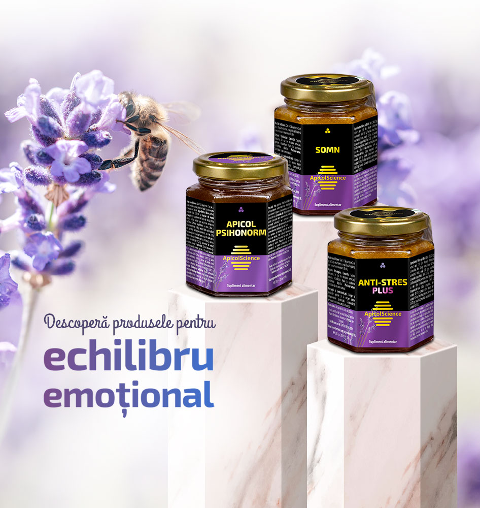 Descoperă amestecul nostru unic de ingrediente naturale, fără substanțe chimice sau intervenții genetice: produse ale stupului, extracte din plante medicinale și uleiuri esențiale, armonios integrate în miere, capsule, creme, tincturi și spray-uri.